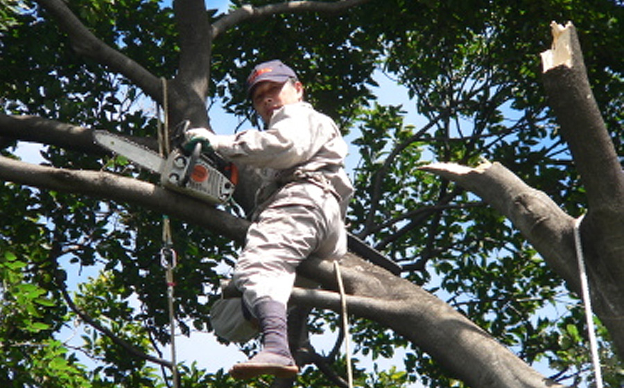 ロープと安全ベルトを駆使して、スタスタと登っていく姿は、プロを感じます。住宅の庭に植えた木が大きくなりすぎたり、枯れて危なくなったりで、途中から切ったり、根元から切り倒したりというような作業から、神社仏閣の巨木まで、色々な仕事をこなしているそうです。特に他の業者から出来ないと断られた難しい作業を頼まれることもけっこうあるそうです。